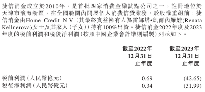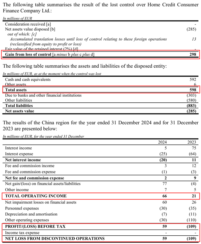PPF提到,由于丧失了对捷信消费金融有限公司有限公司的控制权,集团在中国的业务也被终止。因此,根据国际财务报告准则第5号,截至2023年12月31日的合并损益表中的比较数据已重新列报,整个中国地区的财务数据作为非连续性经营列报。需要指出的是,去年12月20日,天津银行公告披露,按照中国企业会计准则编制,捷信消费金融2022年、2023年税前利润分别是0.69亿元、-42.65亿元,税后利润分别是0.34亿元、-31.99亿元。