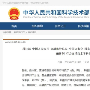2025年5月14日科技部 中国人民银行 金融监管总局 中国证监会 国家发展改革委 财政部 国务院国资委 关于印发《加快构建科技金融体制 有力支撑高水平科技自立自强的若干政策举措》的通知: