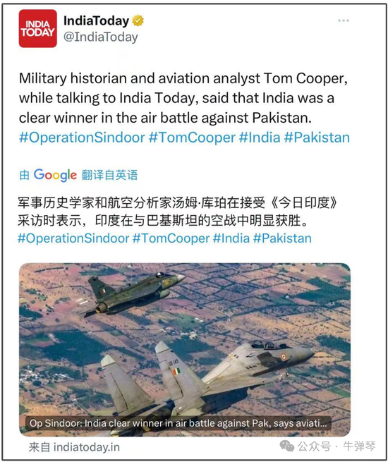 我看了一下,印度媒体也是各种欢呼。比如,印度历史学家和航空分析专家库珀,在接受《今日印度》采访就断言:印度在巴基斯坦的空战中,明显获胜。