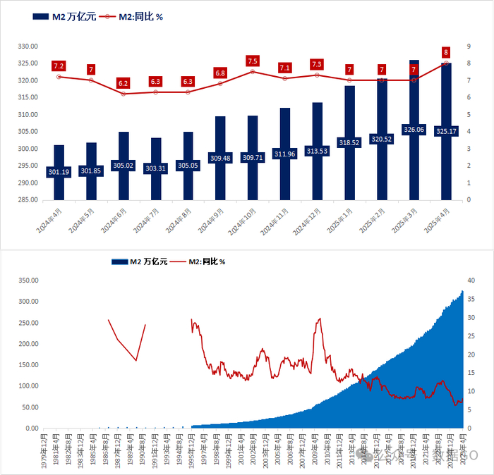 根据官方数据,截止2025年4月底,M2余额3325.17万亿,同比增长8%,增幅高于前3个月的7%。根据数据GO测算,4月底M2余额环比减少0.88万亿。