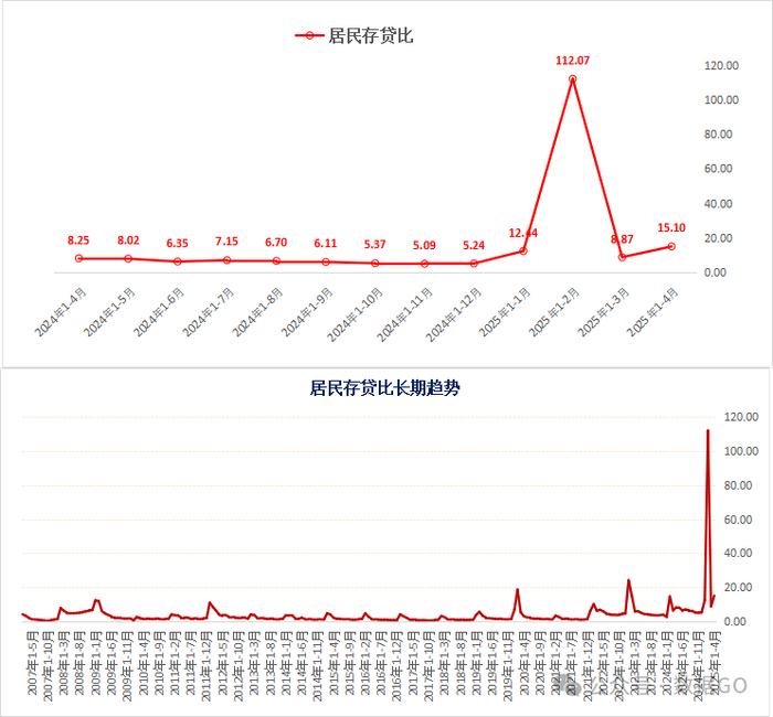 4月份,居民户新增存款-13900亿元,新增贷款-5216亿元。结合过往数据测算,前4月居民存贷比为15.1,比前3月扩大,高于去年同期的8.25。