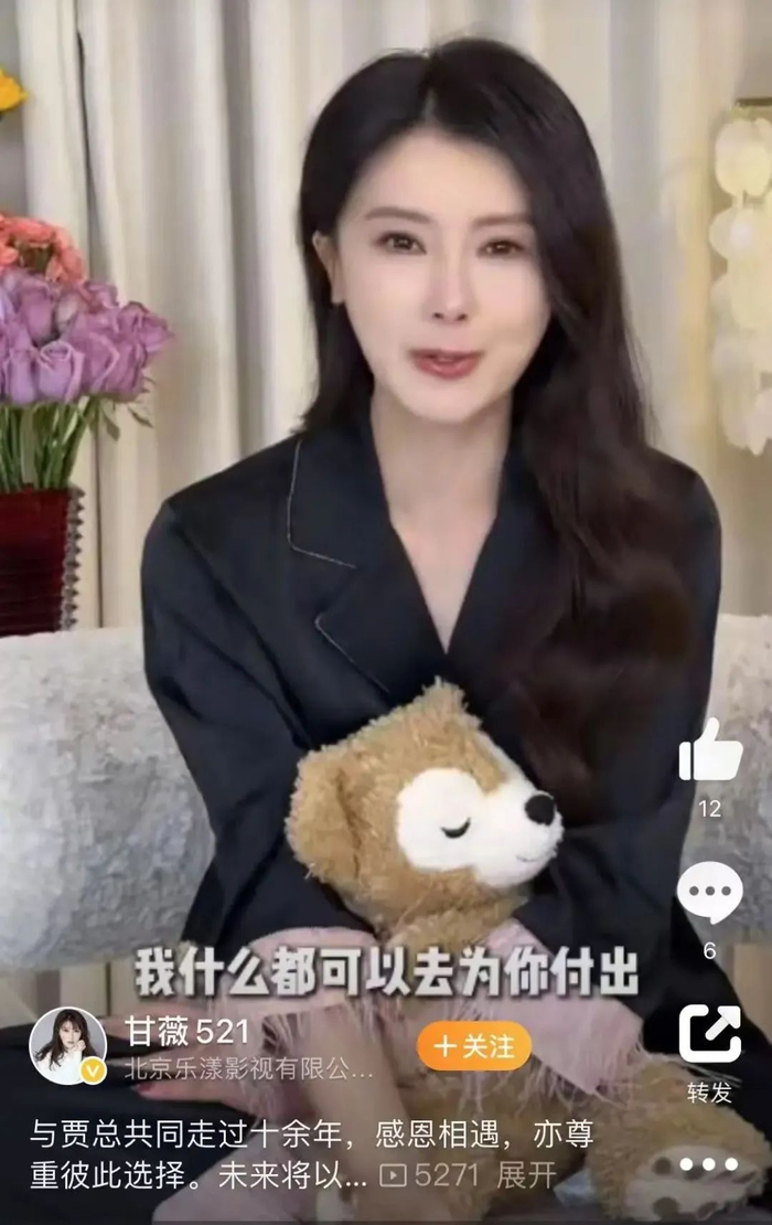 甘薇表示:“与贾总共同走过十余年,感恩相遇,亦尊重彼此选择。未来将以母亲、制片人、公益践行者的身份继续前行。三个孩子是我生命的光,新作品《桃枝气泡》也正在启动中,愿用故事传递更多力量。”