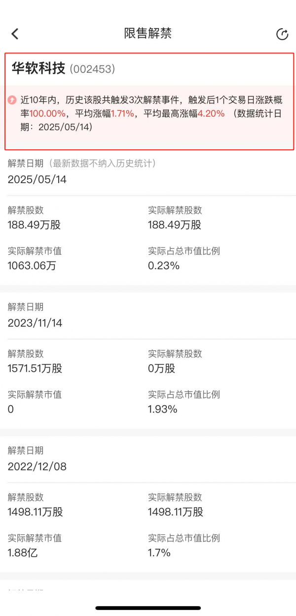 华软科技昨日解禁188万限售股!数据显示,该股历史限售股解禁后,次日股价上涨概率100%!今日走势也初步印证了规律,或许有望突破历史最高涨幅!$华软科技(002453)