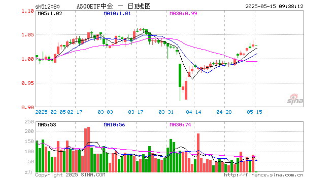 5月15日,A500ETF中金(512080)开盘跌0.19%,报1.027元。A500ETF中金(512080)重仓股方面,贵州茅台开盘跌0.01%,宁德时代涨0.01%,中国平安跌0.55%,招商银行涨0.04%,美的集团跌0.56%,长江电力跌0.07%,比亚迪跌0.03%,兴业银行涨0.26%,紫金矿业跌1.06%,东方财富跌1.64%。