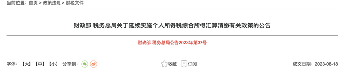 具体政策,可以追溯到财政部和税务总局2023年8月发布的《财政部 税务总局关于延续实施个人所得税综合所得汇算清缴有关政策的公告》。