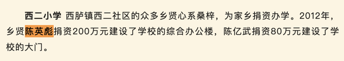 曾经,他是备受赞誉的乡贤。澎湃新闻查阅到,微信公众号“汕头发布”于2022年10月发布的一篇《华侨与乡贤|汕头改革开放以来民间捐资办学那些事儿·潮阳西胪篇》记录,西胪镇西二社区的众多乡贤心系桑梓,为家乡捐资办学。2012年,乡贤陈英彪捐资200万元建设了西二小学的综合办公楼,陈亿武捐资80万元建设了学校的大门。