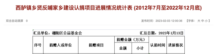 另据潮阳区公益基金会于2023年2月披露的西胪镇乡贤反哺家乡建设认捐项目进展情况统计表,2012年7月-2022年12月底,陈英彪捐赠金额显示为3012万元,排名第9,其中对于西二幼儿园3000万元的认捐时间分别为2014年和2015年,进展显示为拟建。