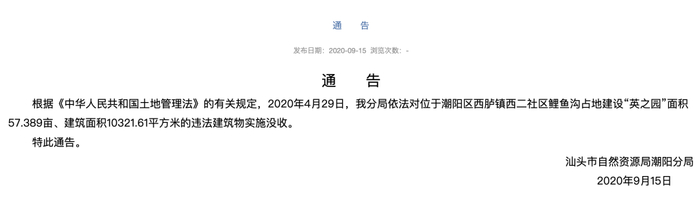 此外,在2020年9月15日,汕头市自然资源局潮阳分局曾发布公告表示,根据《土地管理法》的有关规定,2020年4月29日,该分局依法对位于潮阳区西胪镇西二社区鲤鱼沟占地建设“英之园”面积57.389亩、建筑面积10321.61平方米的违法建筑物实施没收。