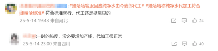5月15日,#娃哈哈客服回应纯净水由今麦郎代工#登上微博热搜,引发热议。据媒体报道,从2024年开始,不断有网友反映购买的娃哈哈纯净水实为今麦郎代工,生产商包括今麦郎隆尧、河源、咸宁、汤阴等多家分公司,其外包装也与娃哈哈工厂生产的纯净水有些许不同。