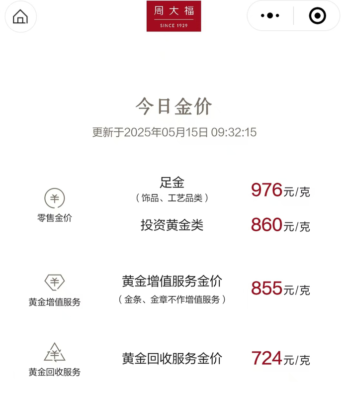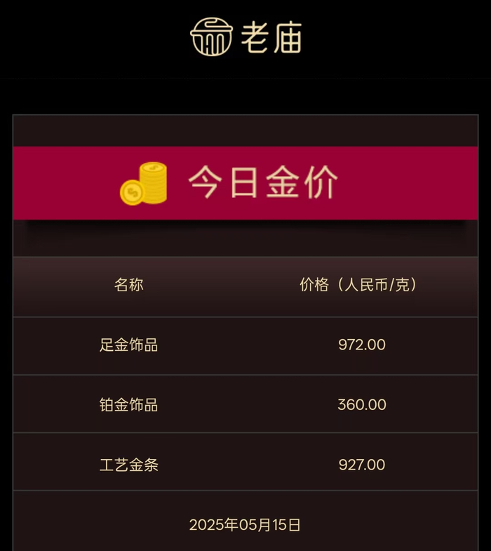 5月15日,足金饰品实时价格显示,老庙黄金为972元/克(5月11日为1019元/克)、周生生为975元/克(5月11日为1021元/克),周大福、周六福、周大生、六福珠宝、老凤祥等均为976元/克(5月11日为1022元/克)。也就是说,4天时间足金饰品累计跌超45元。