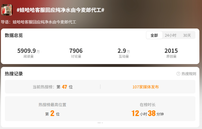 娃哈哈表示,目前市场上在售的娃哈哈纯净水均符合国家质量标准及公司产品质量管理标准,请消费者放心选购。未来,娃哈哈将始终坚持自有生产模式,通过更严苛的质量管控体系,全方位保障消费者的权益,为大家提供更优质、更安全的产品。
