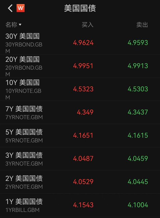 5月15日,美债收益率集体大涨,各期限收益率均超4%,30年期美债收益率逼近5%大关、10年期美债收益率升破4.5%关口。