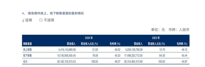 线上渠道方面,海澜之家采取“全渠道、多平台,优势互补”的营销策略,持续发力直播运营、产品聚焦、数字赋能等领域。公司不仅巩固了天猫、京东等传统电商平台的基本盘,还在抖音、快手等新兴社交电商平台进行了深入布局。通过与头部主播合作、开展品牌自播等方式,海澜之家不断提升线上销售业绩。2024年,海澜之家首次联合抖音平台新风潮活动,拿下抖音男装店铺第一名,抖音官方旗舰店拿下多个榜单第一。报告期内,线上实现营收44.19亿元,同比增长35.63%,占总营收21.92%。