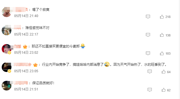 对于纯净水代工一事,有网友认为很正常,只要产品质量能保证就行;也有网友直言“喝了个寂寞”,“不如直接买更便宜的今麦郎”。