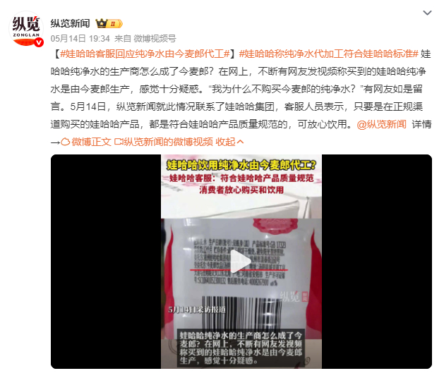 娃哈哈称,目前市场上在售的娃哈哈纯净水均符合国家质量标准及公司产品质量管理标准,请消费者放心选购。未来,娃哈哈将始终坚持自有生产模式,通过更严苛的质量管控体系,全方位保障消费者的权益,为大家提供更优质、更安全的产品。