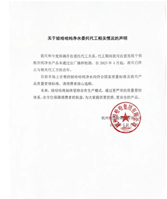 娃哈哈表示,公司和今麦郎确存在委托代工关系,代工期间公司自查发现个别批次纯净水产品未通过出厂抽样检测。自2025年4月起,公司已终止与相关代工方的合作。