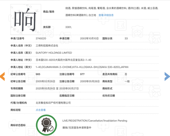 目前,国家知识产权局商标局网站已做更新,三得利旗下国际分类为33酒类,申请注册号为3749220的威士忌品牌“响”商标已是正常注册状态。