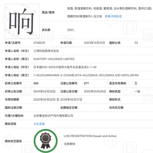 有相关知识产权专业人士表示:“这与三得利注册的这个‘响’商标的时间有关,其注册于2005年,年限已有20年之久。而这类单个汉字商标能顺利申诉注册下来的基本都是最少15-20年以前就注册过的才行了,最近几年的商标不可能注册成功。”