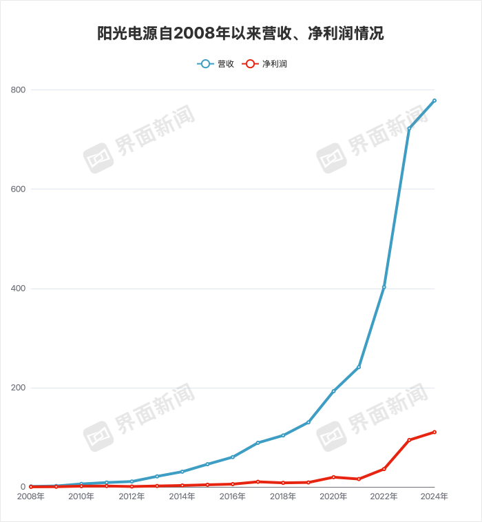 2008-2024年,阳光电源年营收一直保持着增长;净利润虽有波折,但总体呈上涨趋势。