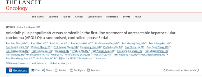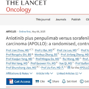 2025年5月13日,国际顶级肿瘤学期刊《柳叶刀·肿瘤学》(The Lancet Oncology,IF:41.6)正式发表了中国生物制药旗下正大天晴的1类创新药盐酸安罗替尼胶囊联合派安普利单抗注射液一线治疗晚期肝细胞癌(HCC)的Ⅲ期临床研究(APOLLO研究)结果。该研究显示,联合疗法在无进展生存期(PFS)和总生存期(OS)双终点上均显著优于对照组索拉非尼,成为全球第二项“小分子TKI联合免疫”双阳性Ⅲ期研究,为晚期肝癌患者提供了全新治疗选择。