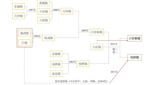 按撤并方式分类:(1)一镇合并其他镇,共计23次,新镇沿用其中一镇名字,如唐镇合并王港镇形成新的唐镇,驻地在原唐镇;又如书院镇和新港镇合并为新书院镇,但驻地却在原新港镇;(2)两镇合并为新镇,共计2次,新镇并不沿袭原镇名,而是重取新名,如龚路镇和顾路镇合并为曹路镇(驻地新址),又如施湾镇和江镇合并为机场镇(驻原江镇);(3)其他撤并形式,共计3次,如川沙、祝桥、六灶等撤三建二的过程,是尤其典型且复杂的案例(图2)。