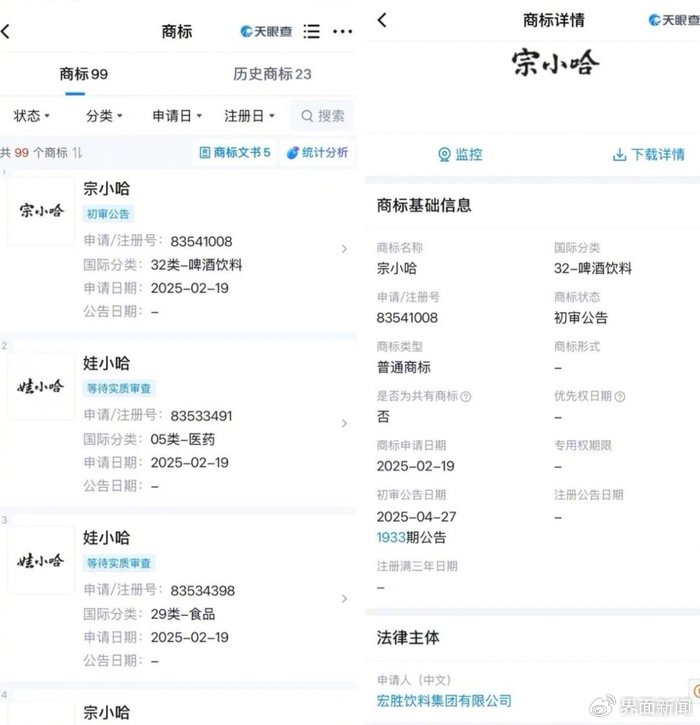 界面新闻注意到,娃哈哈在5月12日通过官方账号“娃哈哈家园”披露了一款品牌名为“娃小宗”的无糖茶新品,该品牌此前不在娃哈哈的产品系列当中。从天眼查的工商信息显示,宗馥莉完全掌控的宏胜饮料集团有限公司在今年2月19日集中申请了“宗小哈”、“娃小哈”和“娃小宗”等多个商标,其中有5个已经通过初审公告,但尚未完成整个商标注册流程。