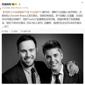 5月15日,据热度新闻,媒体报道贾斯汀·比伯陷入经济危机,欠前经纪人Scooter Braun上百万美元,目前没有偿还。