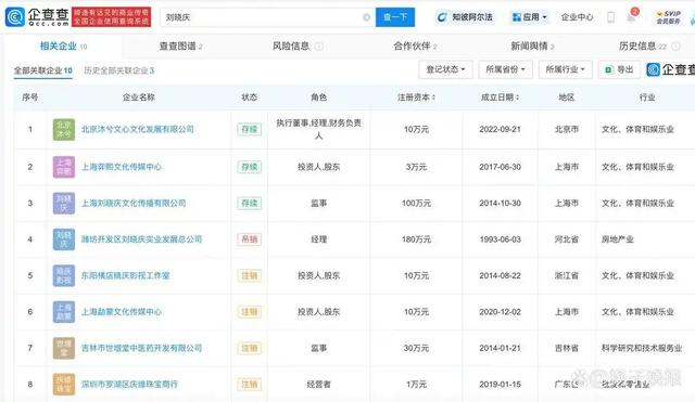 据企查查信息显示,刘晓庆名下关联10家企业,7家为吊注销状态,仅3家公司存续,行业均涉及文化、体育和娱乐业。其担任被指控的上海弈熙文化传媒中心投资人角色,该公司成立于2017年6月,出资额3万元。