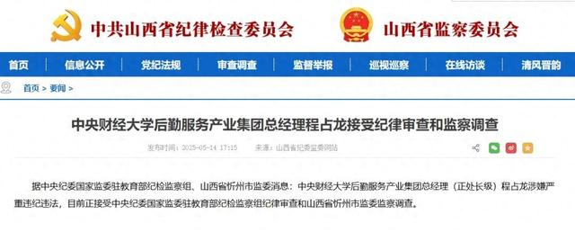 据中央纪委国家监委驻教育部纪检监察组、山西省忻州市监委消息:中央财经大学后勤服务产业集团总经理(正处长级)程占龙涉嫌严重违纪违法,目前正接受中央纪委国家监委驻教育部纪检监察组纪律审查和山西省忻州市监委监察调查。