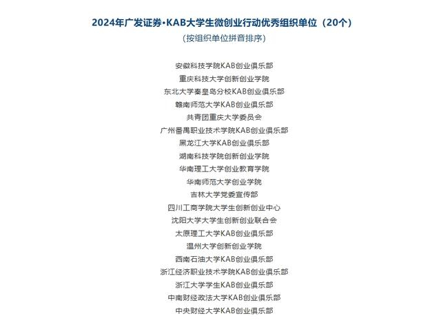 为引导大学生积极投身科技创新、乡村振兴、绿色发展等领域创新创业。KAB全国推广办公室、广发证券社会公益基金会联合举办2024年广发证券·KAB大学生微创业行动,积极搭建大学生创业与风投机构对接路演展示平台,该活动得到广发证券股份有限公司、中国青年报社及百所高校KAB创业俱乐部的支持。