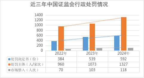 2024年,证监会持续加大执法力度,依法从严查办证券期货违法案件739件,作出处罚决定592件、同比增长10%,处罚责任主体1327人(家)次、同比增长24%,市场禁入118人、同比增长15%;向公安机关移送涉嫌犯罪案件和线索178件,同比增长51%。