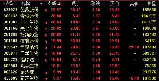 合成生物概念盘中强势拉升,截至收盘,芭薇股份30%涨停,青松股份、川宁生物、洁雅股份、美农生物等20%涨停,回盛生物涨超10%。