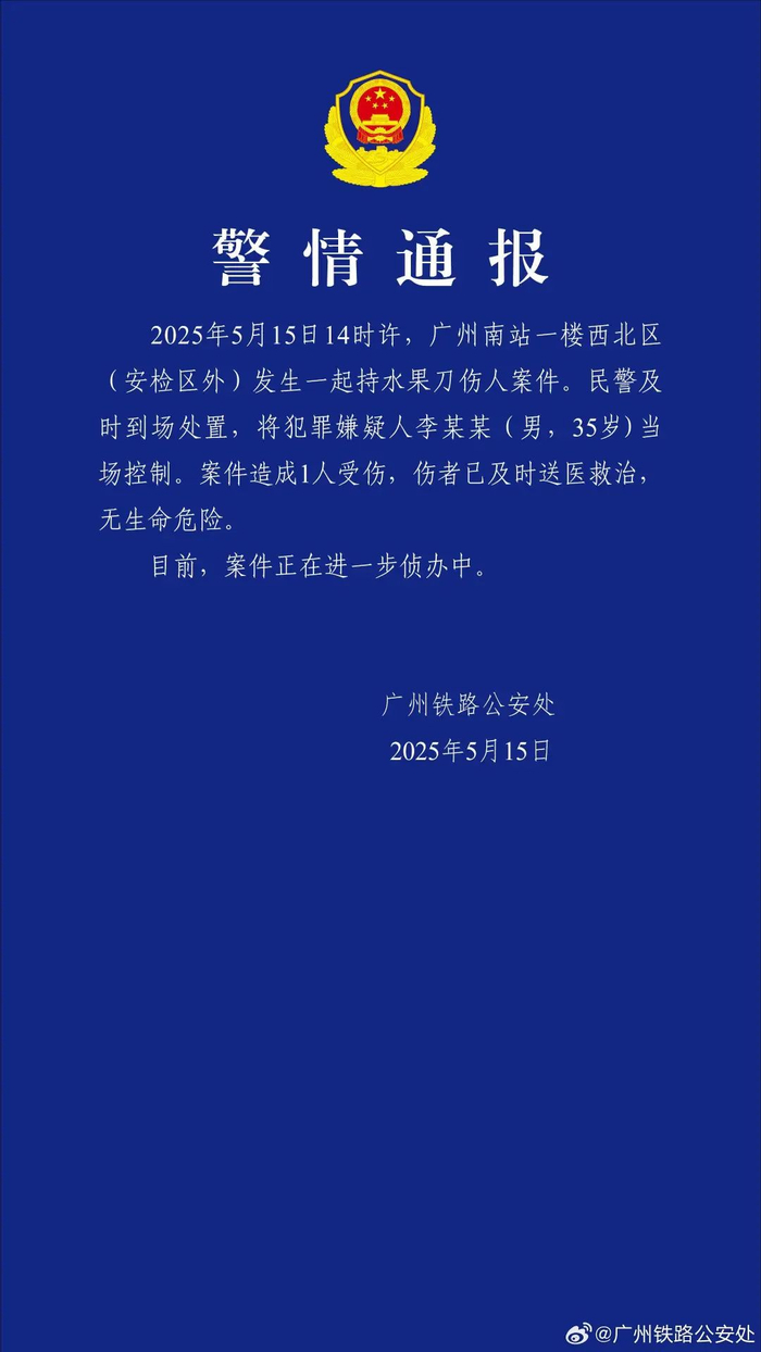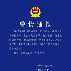 2025年5月15日14时许,广州南站一楼西北区(安检区外)发生一起持水果刀伤人案件。民警及时到场处置,将犯罪嫌疑人李某某(男,35岁)当场控制。案件造成1人受伤,伤者已及时送医救治,无生命危险。