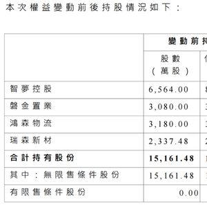 智梦控股及其一致行动人通过集中竞价方式累计减持公司H股股份1.07亿股,占公司总股本的13.39%。减持完成后,智梦控股及其一致行动人合计持有公司股份4481万股,占公司总股本的5.62%。