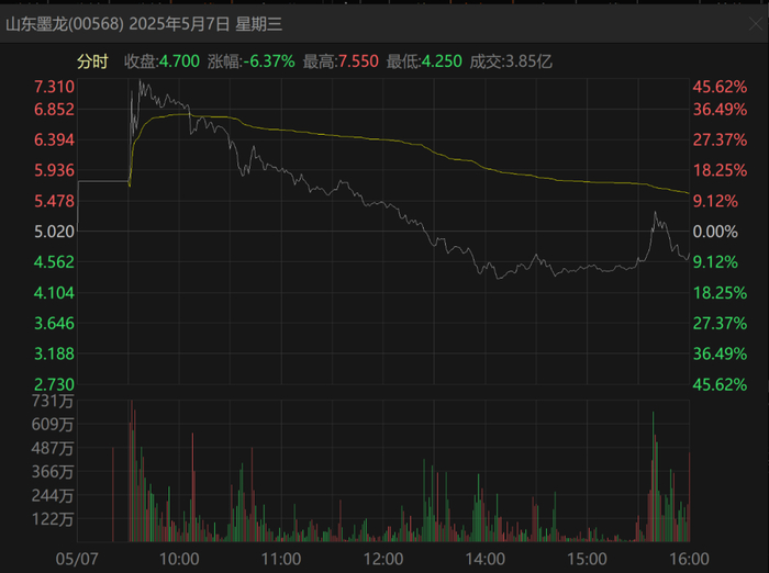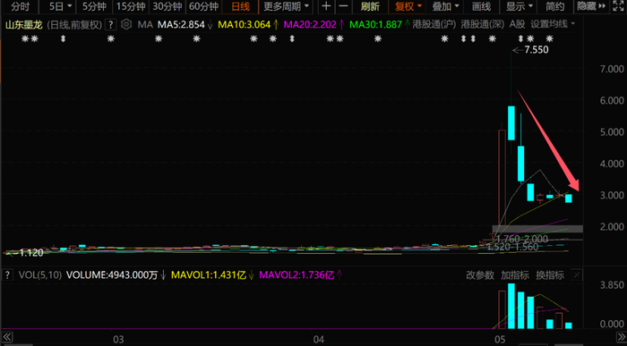从5月7日早盘的高点,到5月9日收盘,山东墨龙在三个交易日内狂跌63%以上!