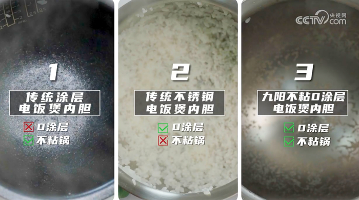 参与测试的三台电饭煲分别为传统涂层电饭煲、普通无涂层电饭煲以及九阳不粘0涂层电饭煲。