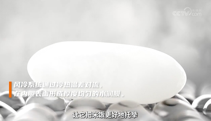 “这一层水润膜,它更多的物质是米浆以及水分,其实它是米饭当中的一部分,它不像传统涂层饭煲是通过化学涂层在表面形成一层物理隔离。我们的风冷水润膜技术表面的不粘效果能够达到类似于荷叶仿生的表面疏水效果,所以我们的水润膜是安心的、健康的。”