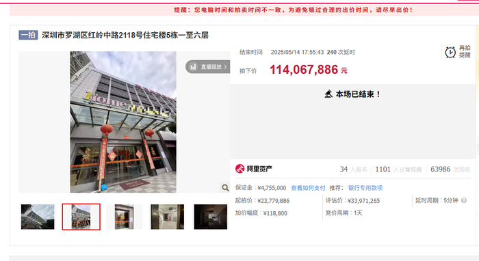 5月14日,位于深圳市罗湖区红岭中路的2118号住宅楼5栋1—6层法拍房结束拍卖,最终34名竞拍者经过450轮出价竞拍,将这栋建筑面积3333平方米的法拍房的报价定格在1.14亿元,远远高于约2378万元的起拍价。按照单价计算,最终竞得单价约每平方米3.42万元,起拍为每平方米7134.7元,溢价率高达379.6%。有业内人士表示,这可能是深圳市场有史以来溢价最高的法拍房之一。