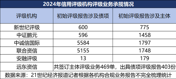 21世纪经济报道记者梳理了11家信用评级机构《2024年业务开展及合规运行情况报告》,对其公开披露的数据进行不完全统计发现,新世纪评级、中证鹏元、安融信用评级、远东资信评估等四家机构2024年出具的评级报告涉及主体数量已经超过了涉及的债项数量。