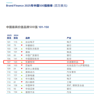 近日,国际权威品牌评估机构Brand Finance发布《2025年中国品牌价值500强》报告。中国品牌总价值突破2万亿美元,同比增长3%,展现出强劲的全球竞争力。其中,东鹏特饮以卓越的品牌强度与价值跃升,位列榜单第107名,较去年大幅提升58位,这不仅彰显了东鹏穿越周期的稳健实力,亦是对中国饮料品牌加速迈向国际一流的有力印证。