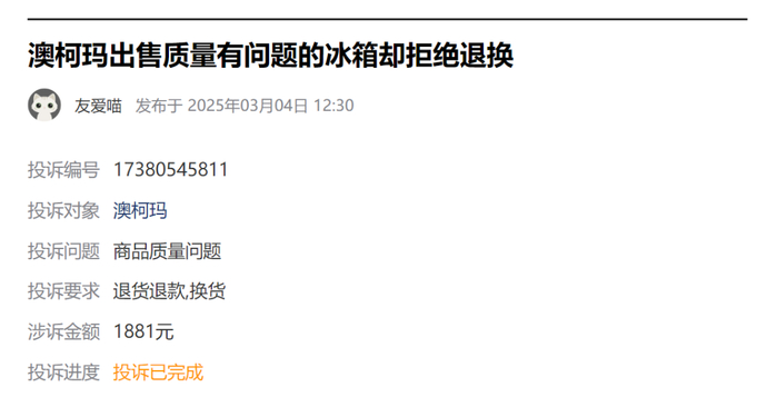 如2025年3月4日,投诉编号173****5811显示,一消费者称,澳柯玛出售质量有问题的冰箱却拒绝退换,要求退货退款,换货。