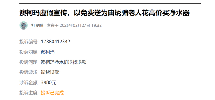 再如投诉编号投诉编号173****6478显示,一消费者称,澳柯玛虚假宣传,以免费送为由诱骗老人花高价买净水器。