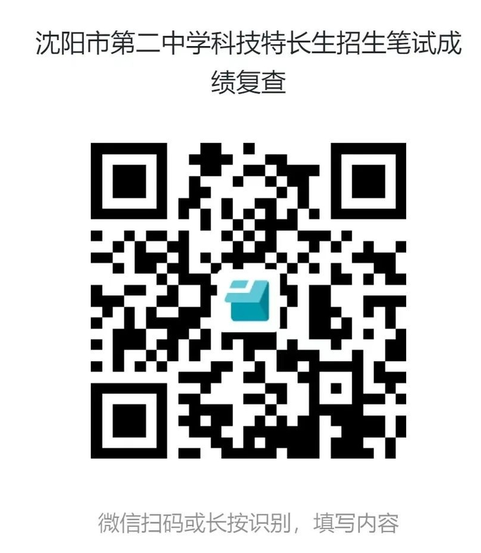 对笔试成绩有异议的考生,可扫描下方“沈阳市第二中学科技特长生招生笔试成绩复查”二维码申请成绩复查,申请复查截止时间为5月31日11:30。