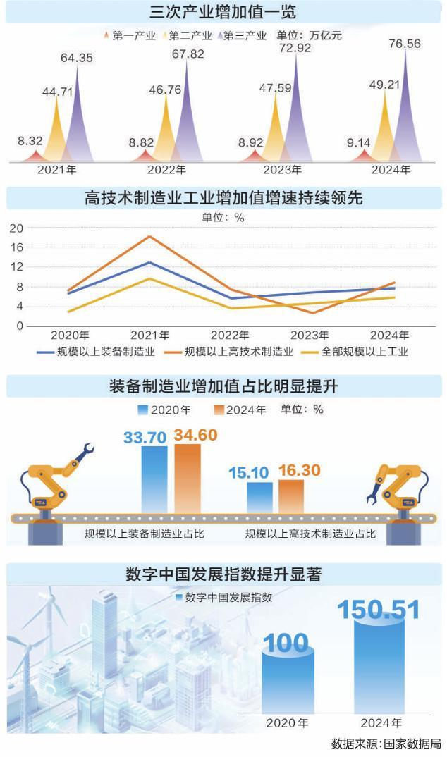 2024年,我国新产业、新业态、新商业模式的“三新”经济增加值占GDP比重进一步提高,超过18%。多项数据领先全球,我国成为全球首个新能源汽车年产量超千万辆的国家,水电风电光伏装机规模稳居世界第一、国际造船市场份额连续15年居于世界第一、5G基站占全球总数的60%以上。