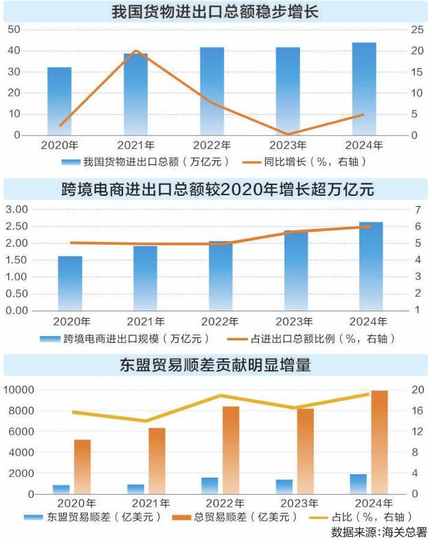 海关总署数据显示,2024年,我国货物进出口总额达43.85万亿元,连续跨越42万亿、43万亿两个大关,规模创历史新高,连续八年保持全球货物贸易第一。与2020年相比,我国的进出口规模增加了11.63万亿元,为“十三五”期间五年增量的1.5倍左右。