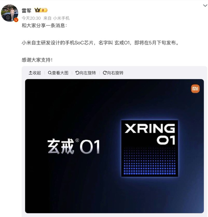 5月15日晚间,小米集团创始人、董事长兼CEO雷军在微博发文:小米自主研发设计的手机SoC芯片,名字叫玄戒O1,即将在5月下旬发布。