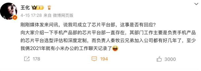 对此,小米集团公关部总经理王化发文回应称:“手机产品部的芯片平台部一直存在,其部门工作主要是负责手机产品的芯片平台选型评估和深度定制,而负责人秦牧云兄弟加入公司都有好几年了,至少我俩2021年就有小米办公的工作聊天记录了。”
