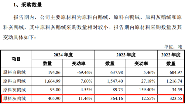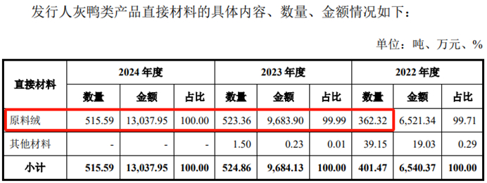 而与此同时,招股书也披露了这4项不同材料对应的成本构成数据,其中针对灰鸭绒这个项目,出了问题。招股书披露灰鸭类产品的直接材料消耗,也就对应着灰鸭绒的消耗数量,在2022年到2024年分别为362.32吨、523.36吨和515.59吨,三年合计就是1401吨。