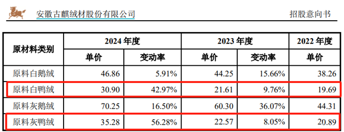 公开信息披露显示,古麒绒材的核心产品是羽绒,从原材料分类来看,包括有白鸭绒、灰鸭绒、白鹅绒、灰鹅绒,鹅绒占比很小,鸭绒特别是白鸭绒是占比最大的采购项目。
