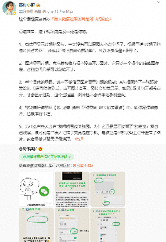 对此,微信员工@客村小蒋 转发该“教程”,回应称“没有一处是对的”。同时,他还详细解释了这一做法行不通的地方。其还称,“过期了的图片还占内存”被冠以“微信最恶心的功能”可以说是造谣+诋毁了。